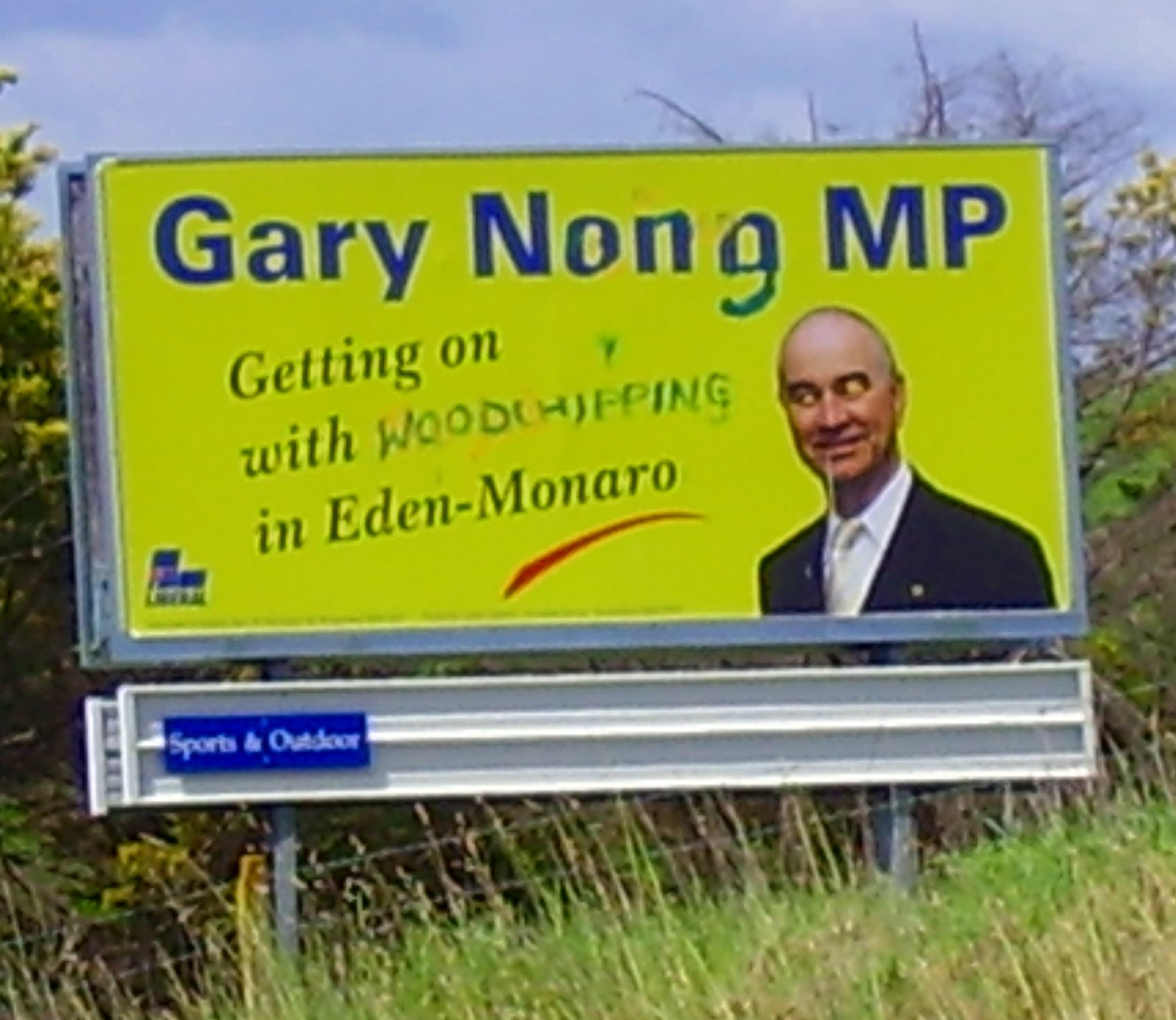 Click to enlarge Gary Nairn MP billboards started appearing on highways all around his electorate just before the 2007 election. This one was near Brogo on the Prince Highway.