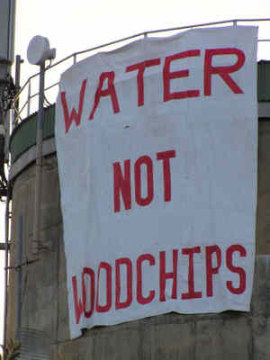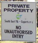 "South East Fib Experts." These modifications on the signage at the Eden chipmill gates appeared on April Fools Day 2008 and were still there in September, apparently causing no concern to the chipmill security staff