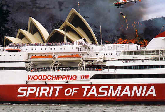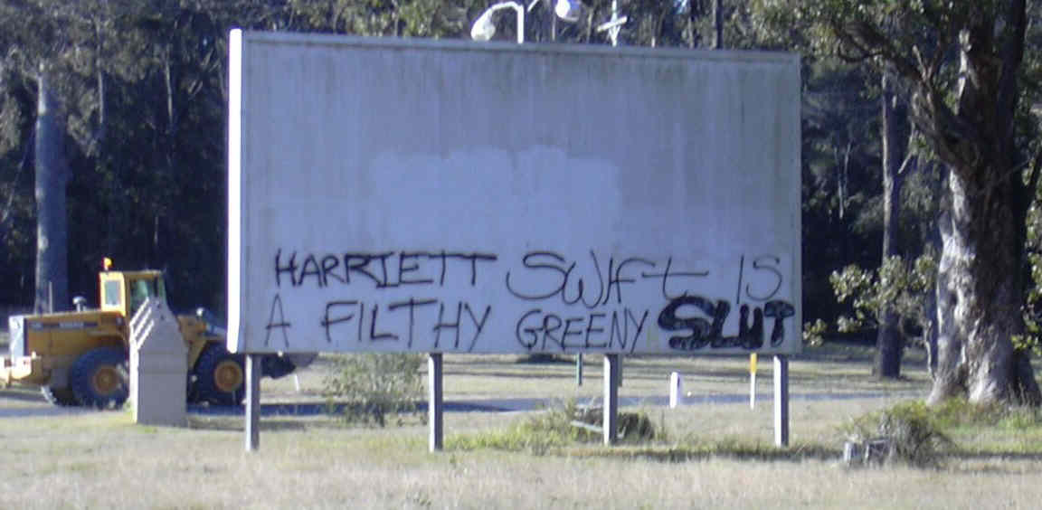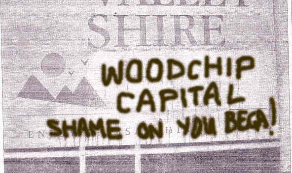The boot can sometimes be on the other foot. This billboard, illuminated all night long remained up in a prominent place on the Princes Highway just north of the Eden chipmill for more than 3 months.