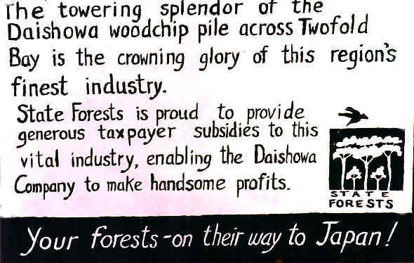 On the Princes Highway between Bega and Eden. Passed by hundreds of tourists, local residents and log trucks every day. Woodchipping the planet's most effective carbon sinks does not make sense to many people.