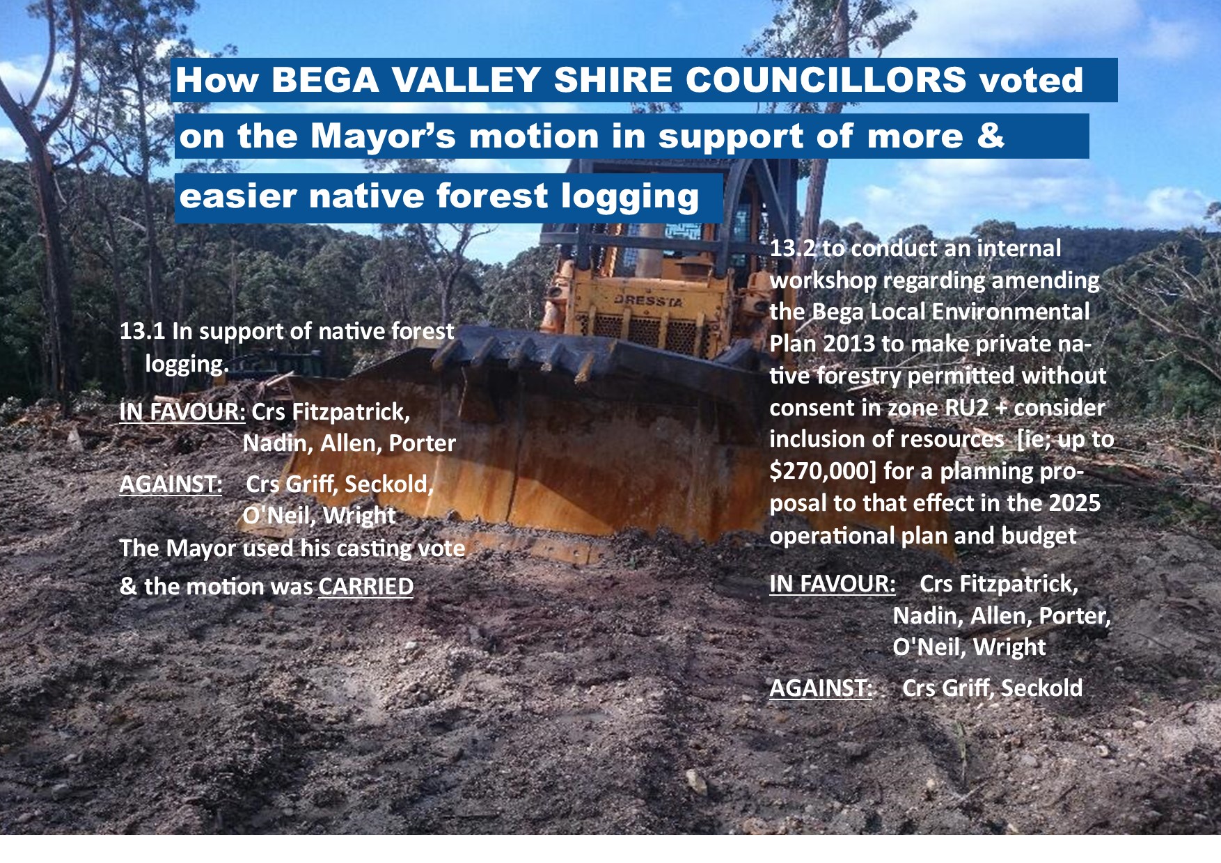 Bega Valley Mayor’s plan to increase native forest logging - Address to council  - How Councillors voted - Council minutes