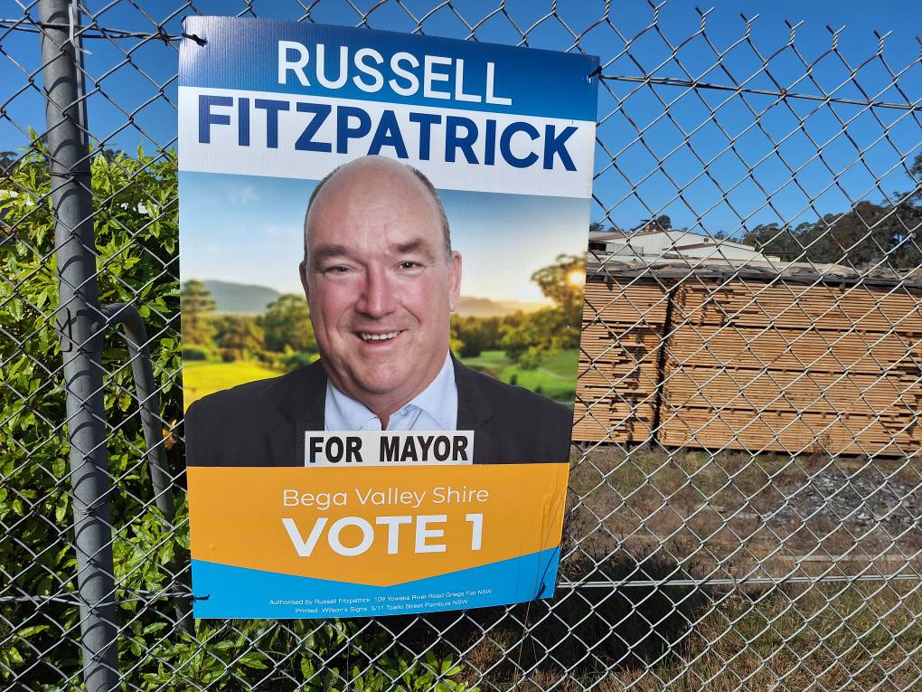 ne of Mayor’s 2024 election corflutes displayed on the fence of South Coast Timbers sawmill at Eden.